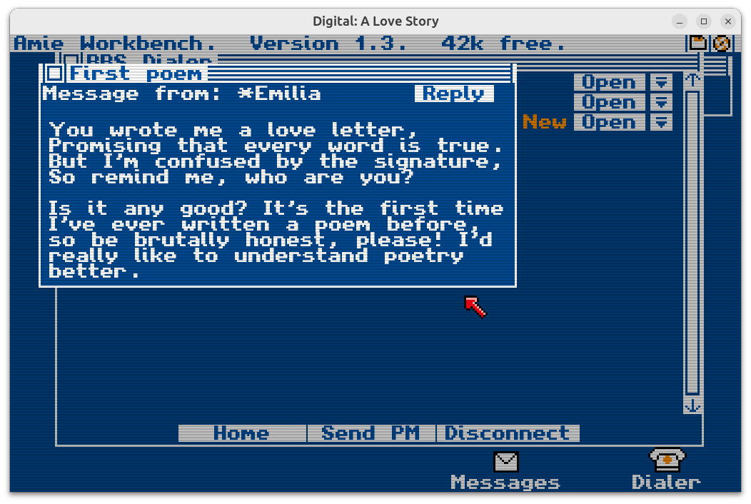 Вы оказываетесь в эпохе середины 80-х: счастливый обладатель новенького домашнего компьютера. Запускаете компьютер и обнаруживаете в нём модем, а также приглашение на некую локальную BBS. Коннектитесь, регистрируетесь на биибэске и включаетесь в переписку с местными обитателями. Дальше будет длинная увлекательная история хакерских приключений в сети, включая любовный онлайн-роман. Официальный сайт: https://scoutshonour.com/digital/.