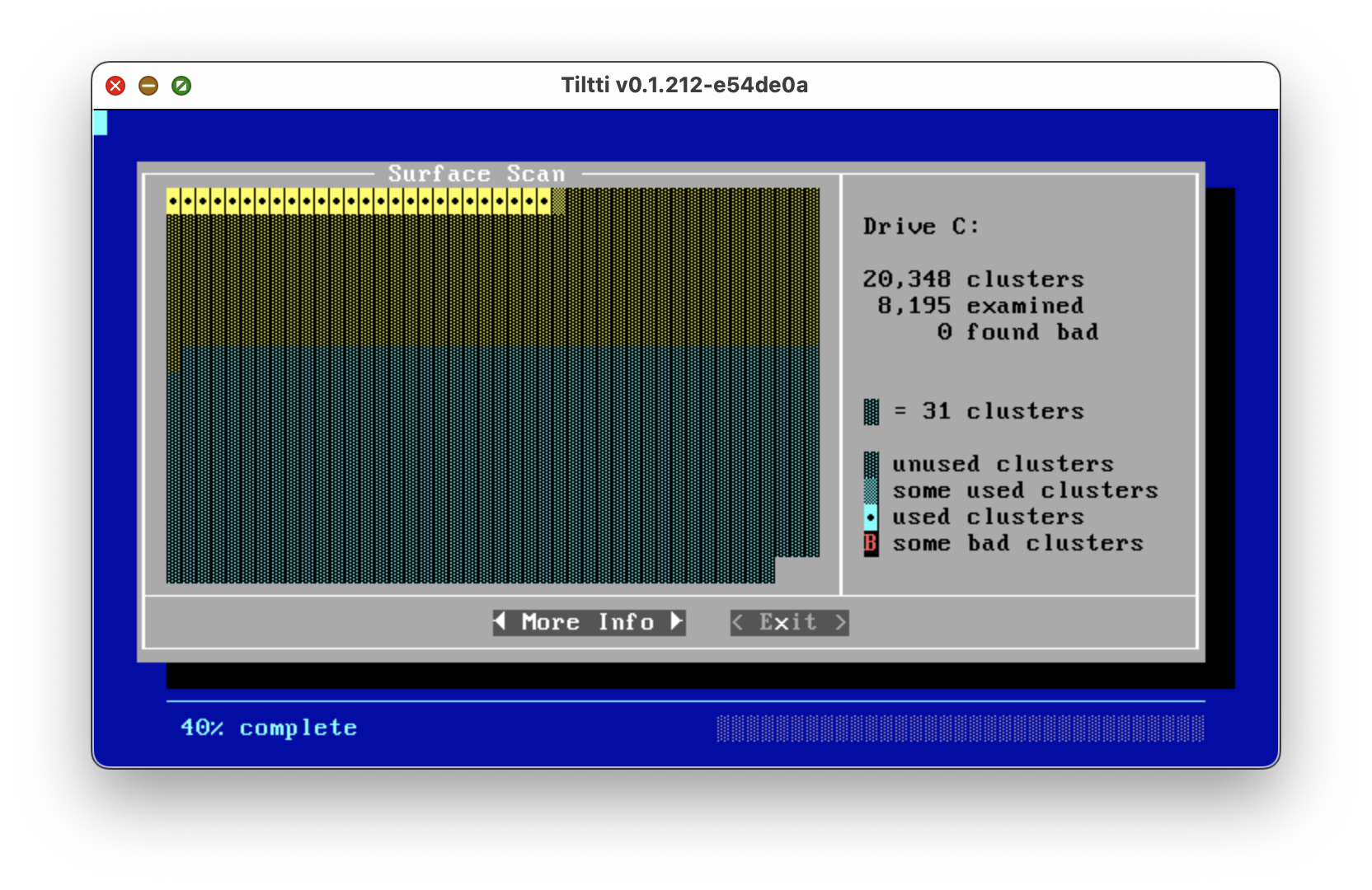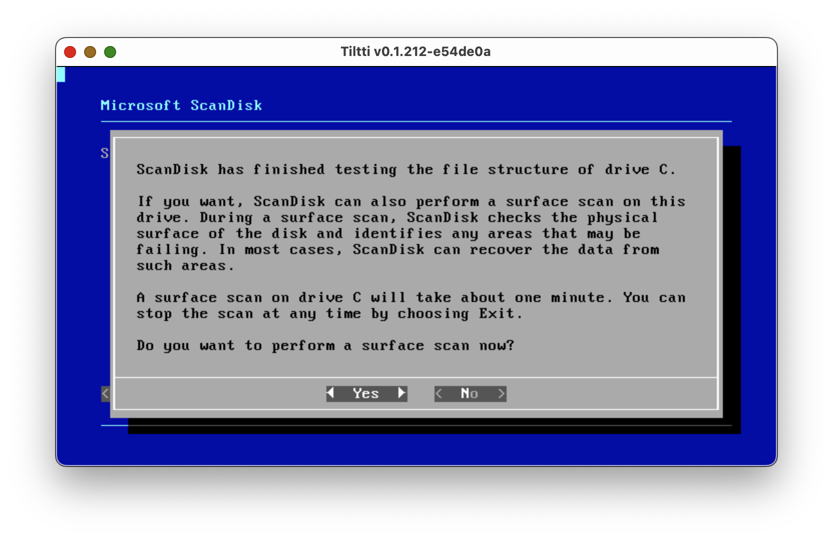 В MS-DOS версии 6 вместо CHKDSK появилась более весёлая утилита SCANDISK. Вот так она смотрится в симуляторе. Проверил под MS-DOS 7.1 - файловую систему FAT32 она тоже успешно проверяет.